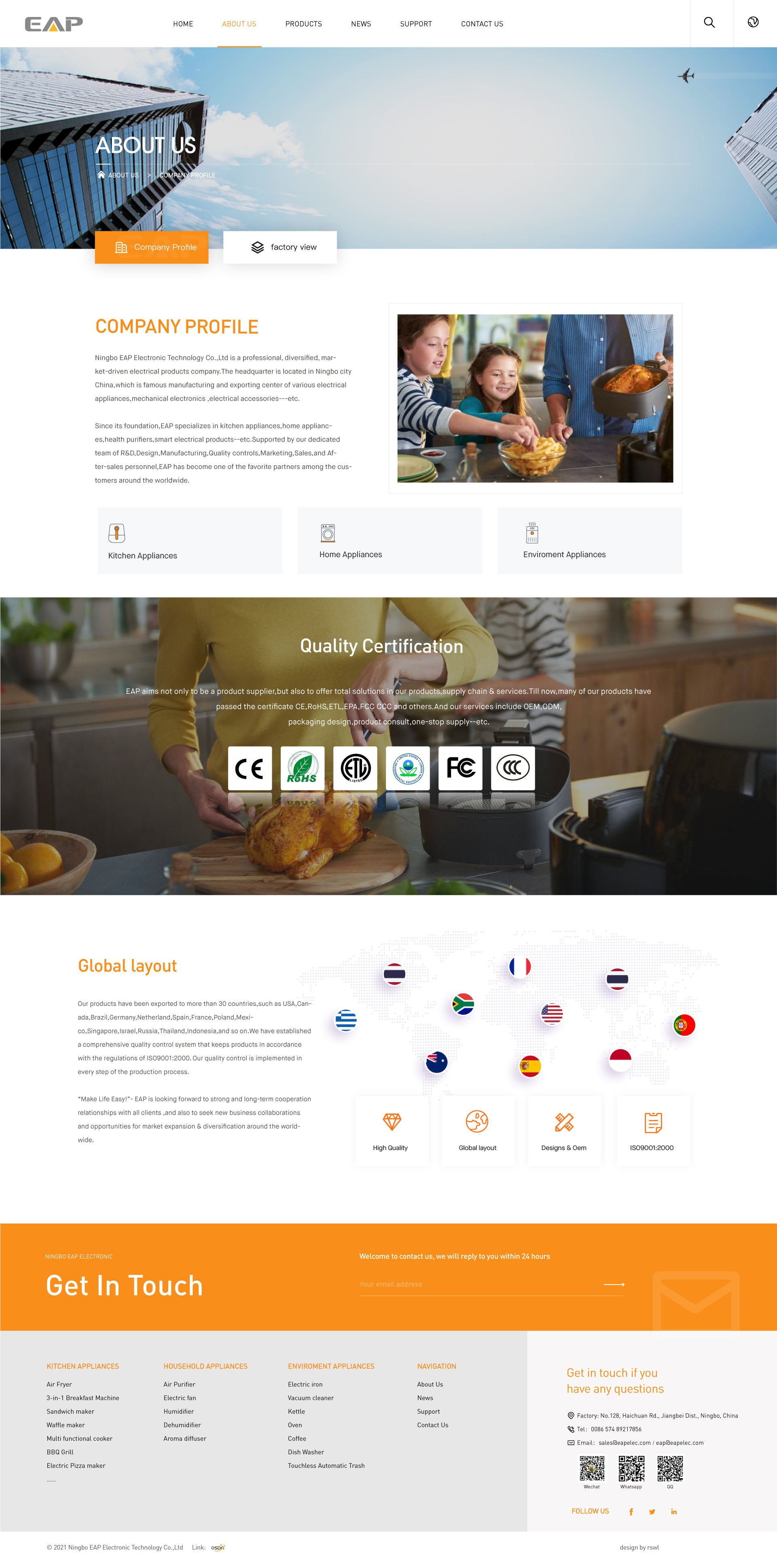 Since its foundation,EAP specializes in Kitchen Appliances, Environmental Appliances, Household Appliances and Personal Care Appliances-etc.Supported by our dedicated team of R&D,Design,Manufacturing,Quality controls,Marketing,Sales,and After-sales personnel,EAP has become one of the favorite partners among the customers around the worldwide.