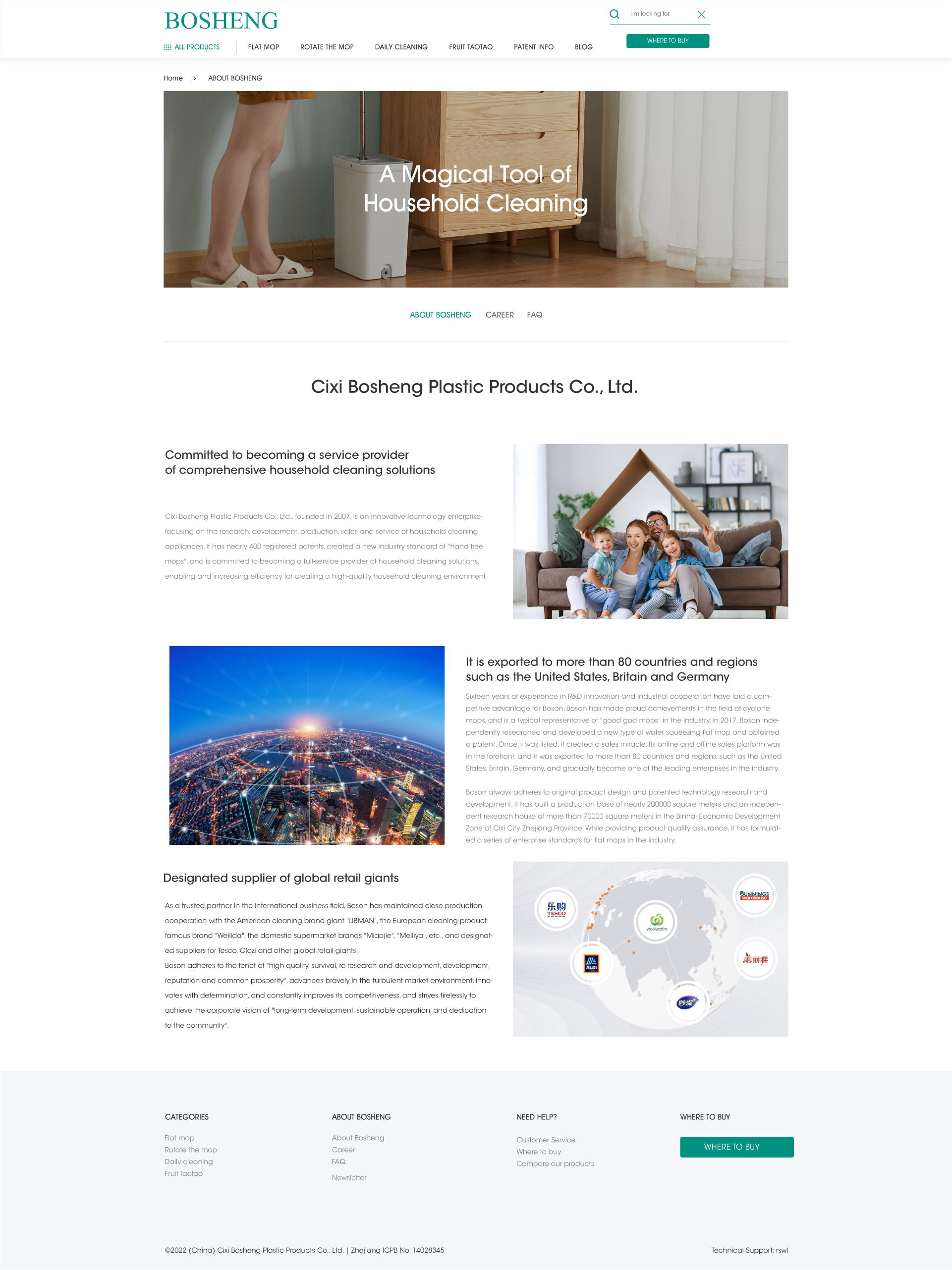 Cixi Bosheng Plastic Products Co., Ltd. was established in 2007. It is an innovative technology enterprise focusing on the research and development, production, sales and service of household cleaning tools. Bosheng has nearly 400 registered patents and created a new industry standard of "hands-free mop". Bosheng committed to becoming a comprehensive household cleaning solution service provider, empowering and increasing efficiency in creating a high-quality household cleaning environment.