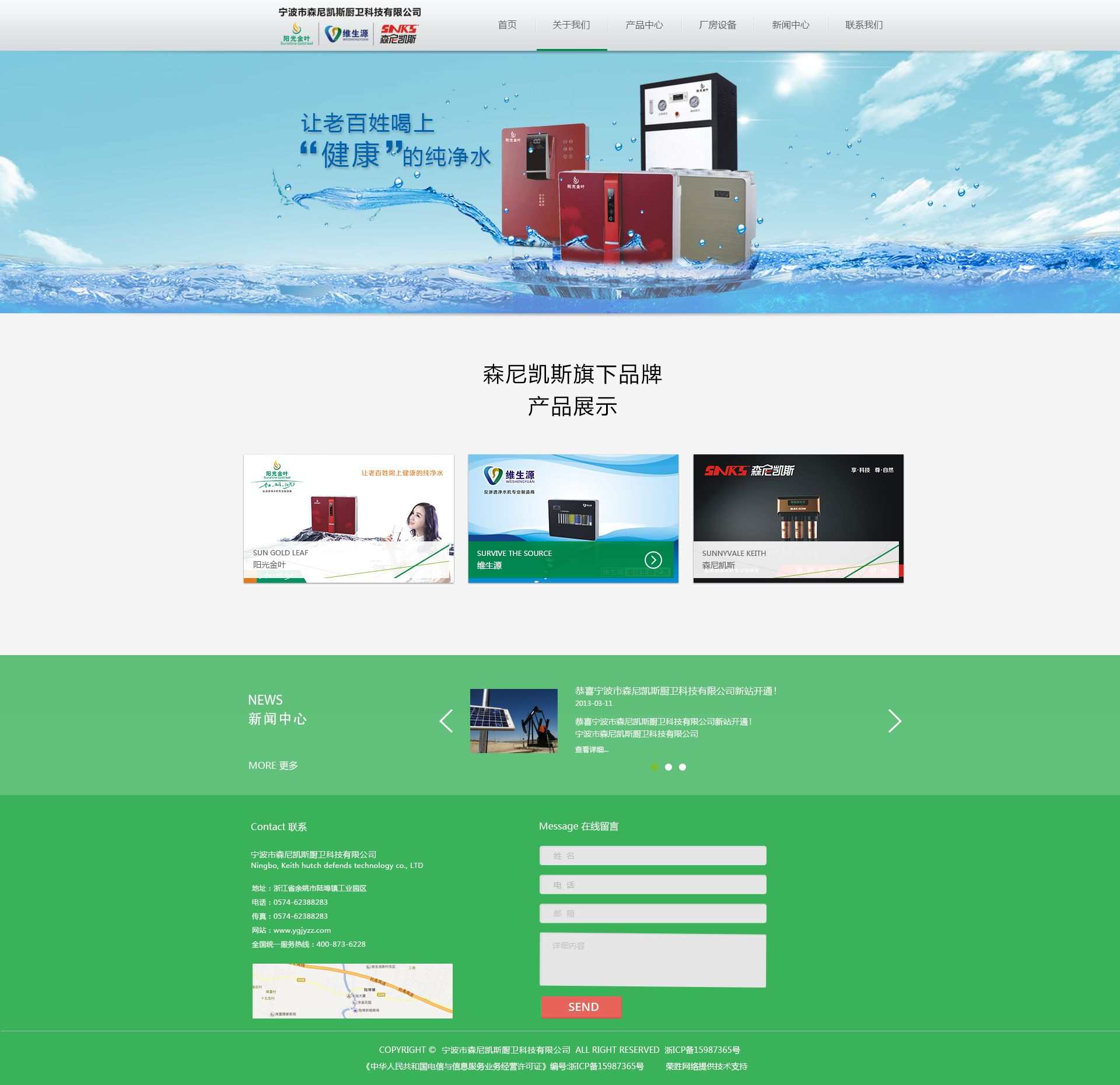 寧波市森尼凱斯廚衛(wèi)科技有限公司是一家實(shí)業(yè)型高端定位的專業(yè)生產(chǎn)凈水機(jī)企業(yè),目前有三大品牌如下:陽(yáng)光金葉、維生源、森尼凱斯。在產(chǎn)品研發(fā)領(lǐng)域,擁有超水平的產(chǎn)品開發(fā)團(tuán)隊(duì),在制造營(yíng)銷領(lǐng)域擁有前衛(wèi)完善的可復(fù)制型經(jīng)營(yíng)模式,我們一直致力于成為最優(yōu)秀的水處理設(shè)備制造商之一、同時(shí)努力創(chuàng)建中國(guó)水處理行業(yè)最有價(jià)值品牌之一。公司生產(chǎn)的家用、商用凈水機(jī),采用了21世紀(jì)最尖端的超濾和反滲透兩大核心技術(shù),能全方位解決家庭及辦公場(chǎng)所的飲用水問(wèn)題。