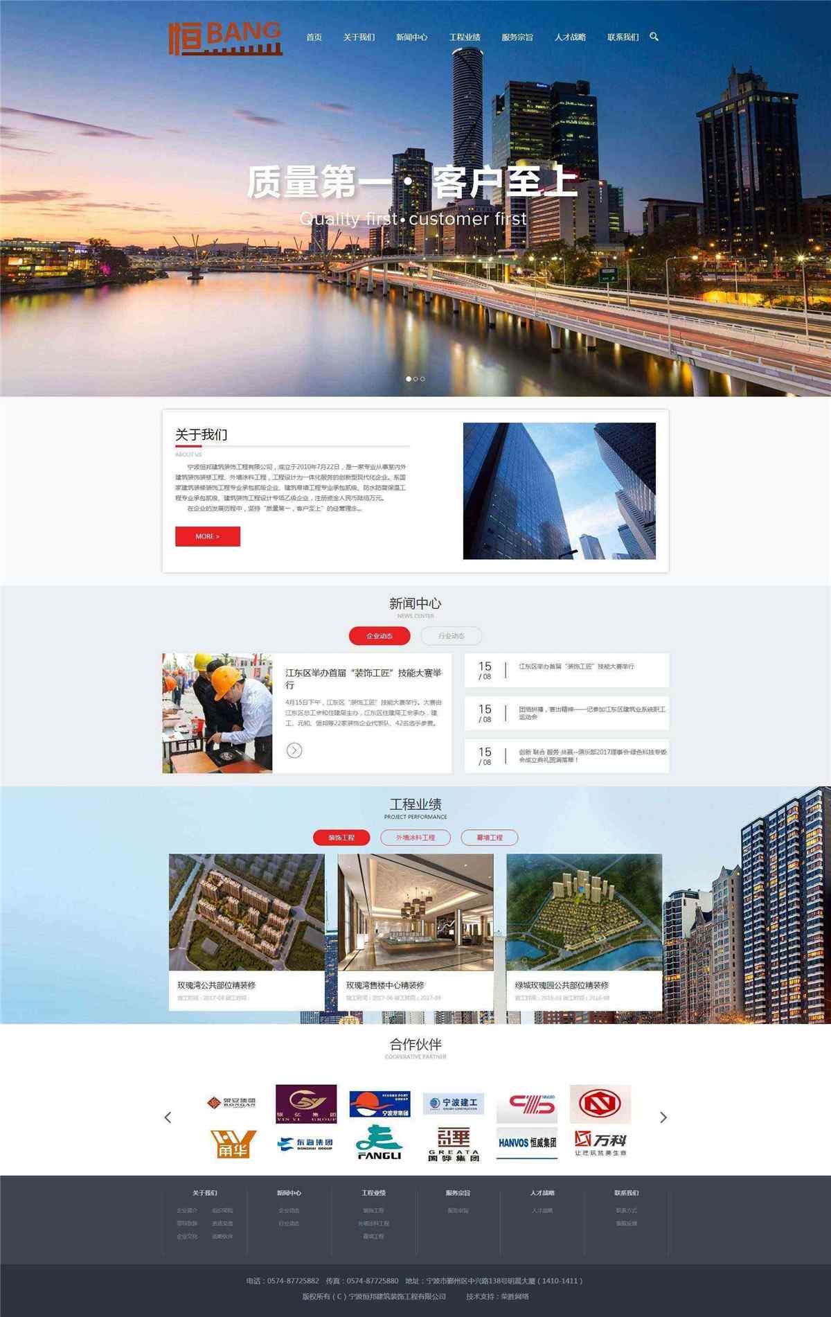 寧波恒邦建筑裝飾工程有限公司,成立于2010年7月22日,是一家專業(yè)從事室內(nèi)外建筑裝飾裝修工程、外墻涂料工程,工程設計為一體化服務的創(chuàng)新型現(xiàn)代化企業(yè)。系國家建筑裝修裝飾工程專業(yè)承包貳級企業(yè)、建筑幕墻工程專業(yè)承包貳級、防水防腐保溫工程專業(yè)承包貳級、建筑裝飾工程設計專項乙級企業(yè),注冊資金人民幣陸佰萬元。