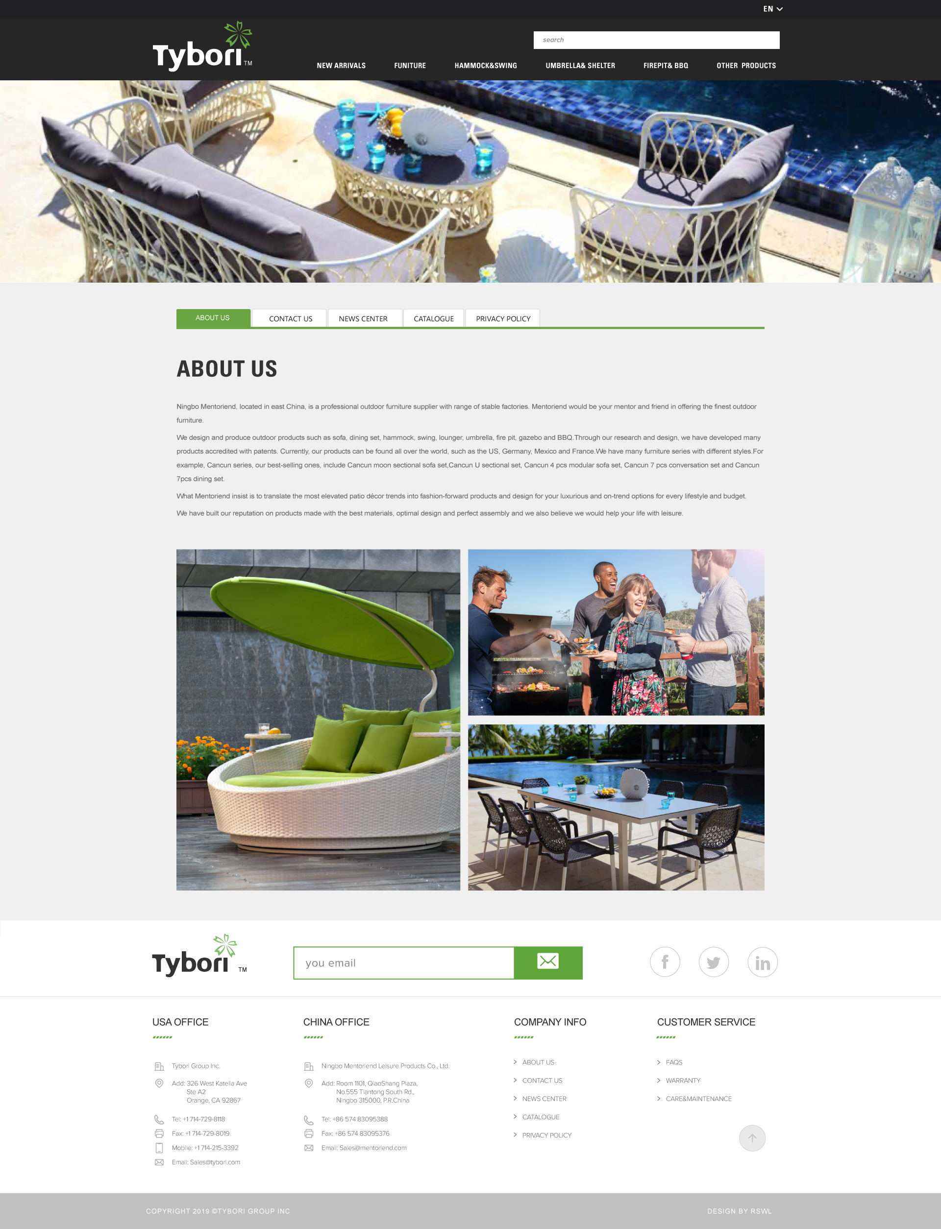 Tybori Group is a company with China resource background, we have US sales office, HK purchase platform, China Mainland design &development office and facility. We are focus on patio living products for more than 13 years, especially in garden furniture sets, hammock and swings, umbrella and gazeboes, firepit and BBQ grill. and also have the relative resourcing and service.
