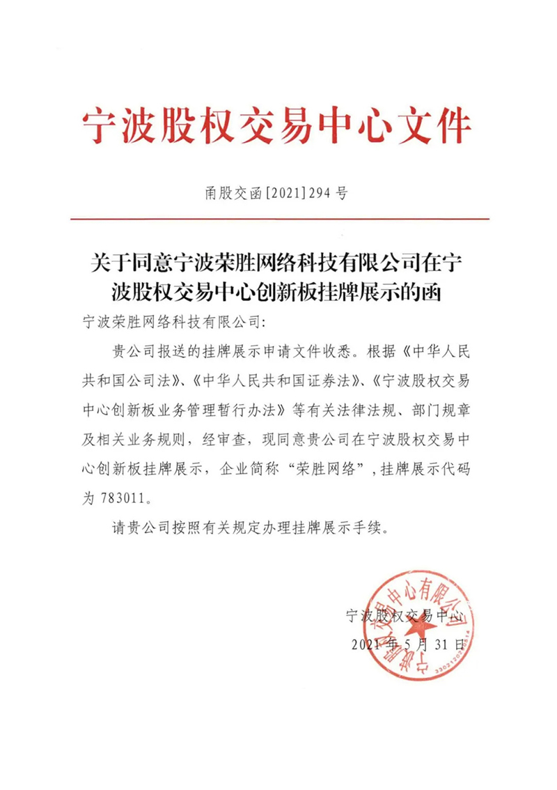 新征程 | 寧波榮勝網(wǎng)絡(luò)科技有限公司正式掛牌寧波股權(quán)交易中心